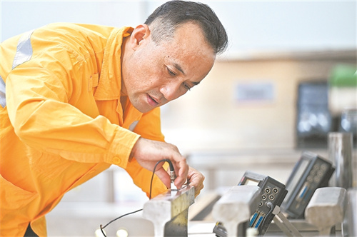 圖為徐鵬在標(biāo)定焊縫探頭的基準(zhǔn)靈敏度。王 瑋 攝