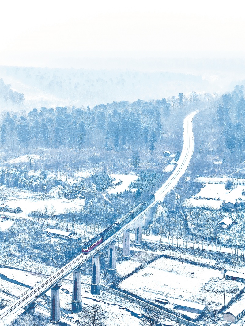 一列公益性“慢火車(chē)”行駛在冬雪覆蓋的長(zhǎng)白山區(qū)。