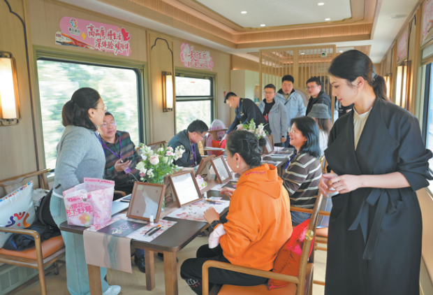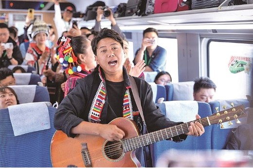 4月14日,演員在昆明開往萬象的列車上表演。新華社發(fā)