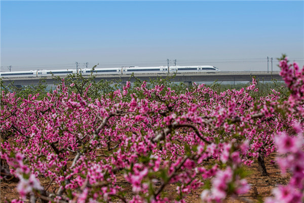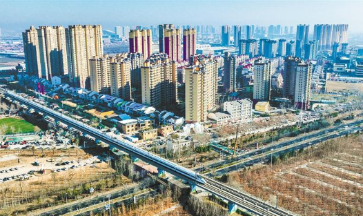 2月1日,一列動車組從塔元莊村旁駛過,村內樓房成行連片。石家莊日報記者梁子棟 攝