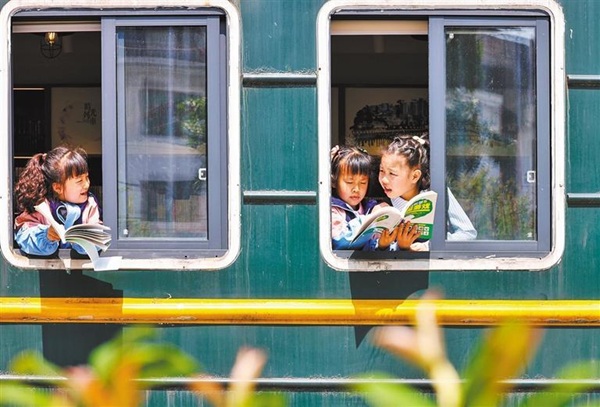 4月17日,小朋友在貴州省銅仁市玉屏縣火車書屋閱讀書籍。當(dāng)?shù)卮蛟斐鞘泄查喿x空間,豐富市民的文化生活。胡攀學(xué)攝(中經(jīng)視覺)