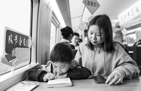 4月20日,一名小旅客在G7378次列車上舉行的“書香伴高鐵 閱讀潤旅途”列車閱讀會上閱讀。當(dāng)日是首個全國“全民閱讀活動周”首日,各地舉行讀...