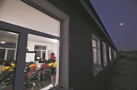 2月5日早晨6點50分,工人開早會布置當天工作。