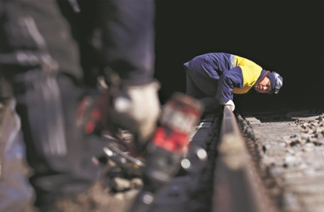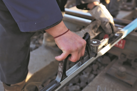 2月4日,鮑有春師傅趴在地上查看鋼軌平整度。