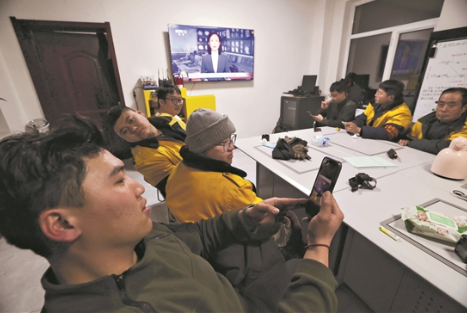 2月5日,工長劉鵬偉(左一)為大家展示剛剛錄制的央視《新聞聯(lián)播》里有關(guān)他們工作的幾秒鐘畫面。
