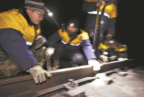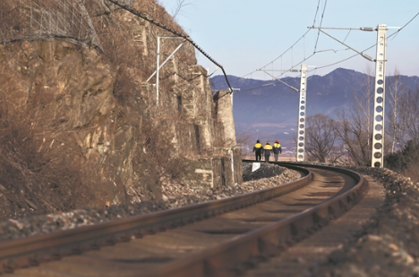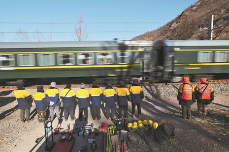 2月5日上午,即將在鋼軌上作業(yè)的工人避讓過往列車。